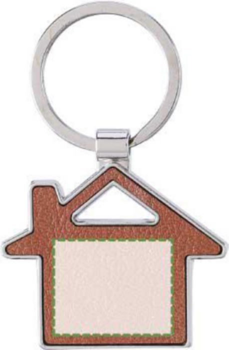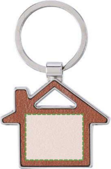 Nyckelring i återvunnet läder med en metallring. I form av ett hus. Inkluderar präglad logotyp återvunnet läder på sidan. Individuellt förpackad i ett brunt kartongfodral.