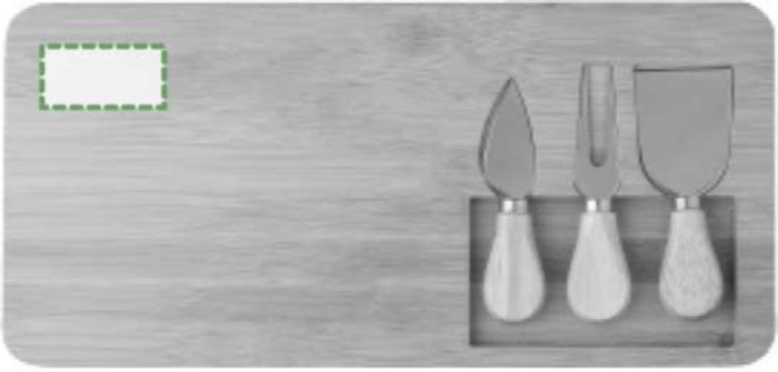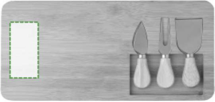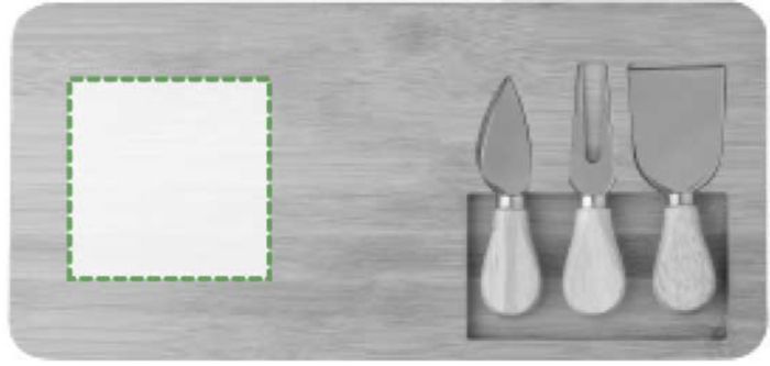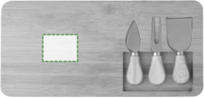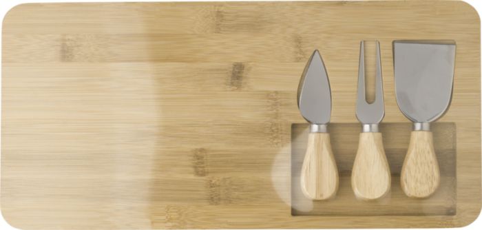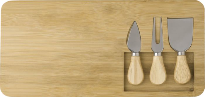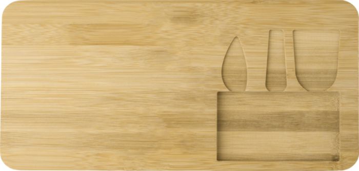 Ostbricka i bambu med tre tillbehör som passar i utskurna fack. Individuellt packad i ask av brun kartong.