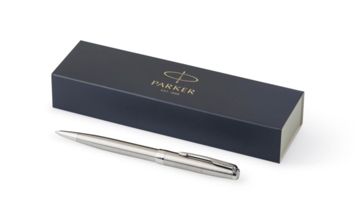Parker Sonnet kulspetspenna i rostfritt stål med klickmekanism. Svart bläck. Förpackad i presentförpackning.