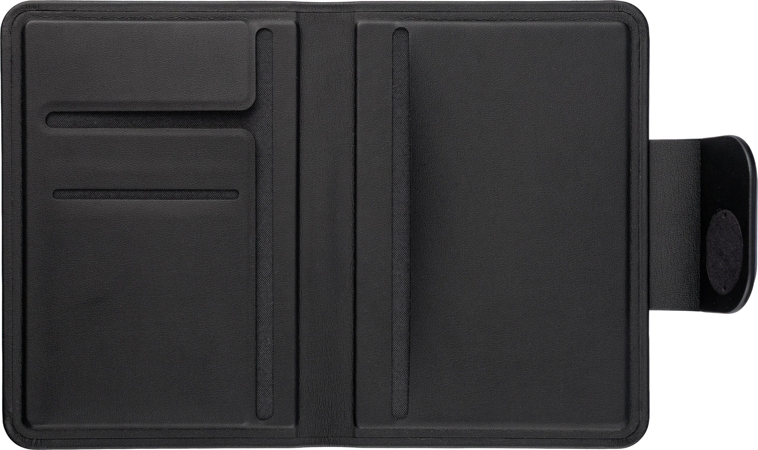 Passfodral i återvunnet PU-hårdpärm med magnetisk stängning och inbyggd Apple FindMy-tracker i fliken. Har tre invändiga fack för att organisera dokument och kort. Använder ”Impression” som enhetsnamn och inkluderar Impression-logotypen för ID-registrering. Individuellt förpackad i en kraftpappersask.