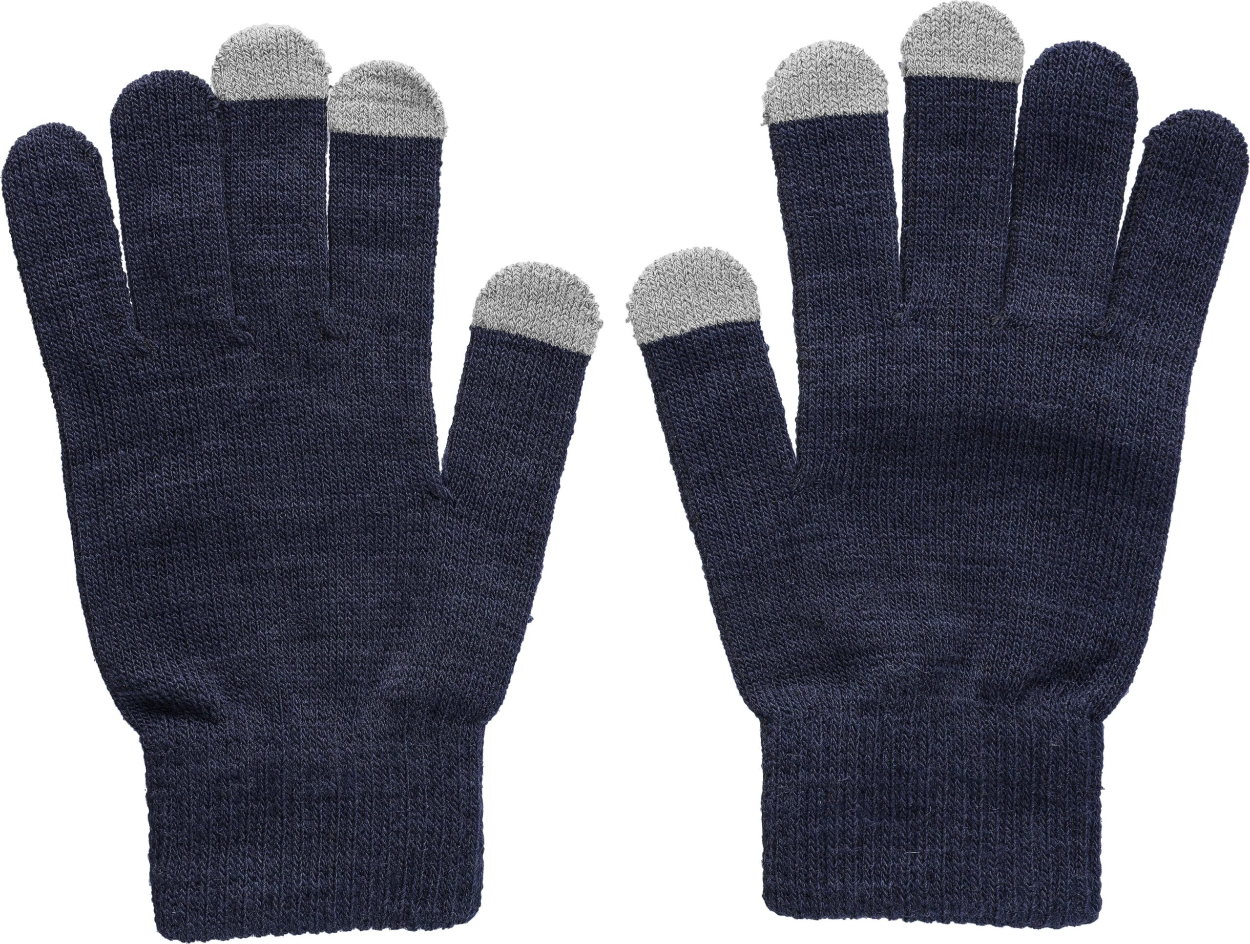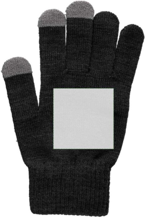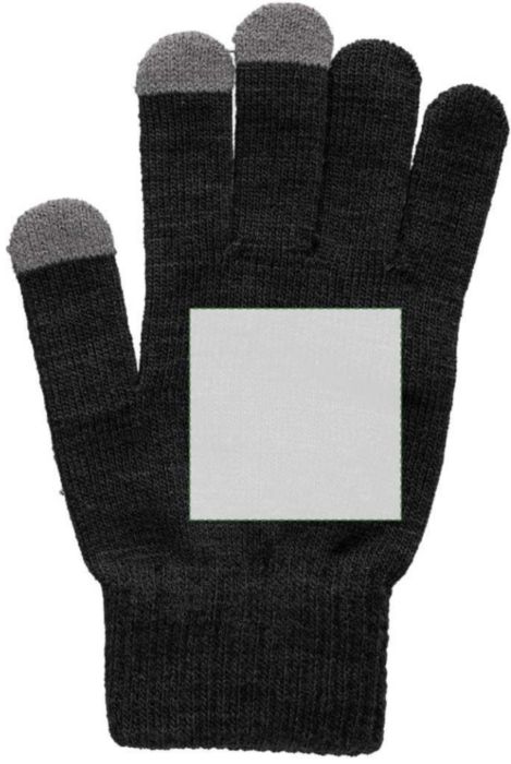 rPET-pekskärmshandskar med ledande beläggning på tre fingrar för skärmanvändning. Inkluderar en rPET-etikett på utsidan och en tvättetikett med information på insidan.