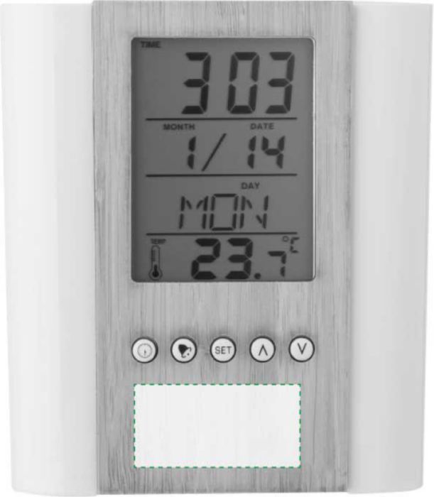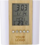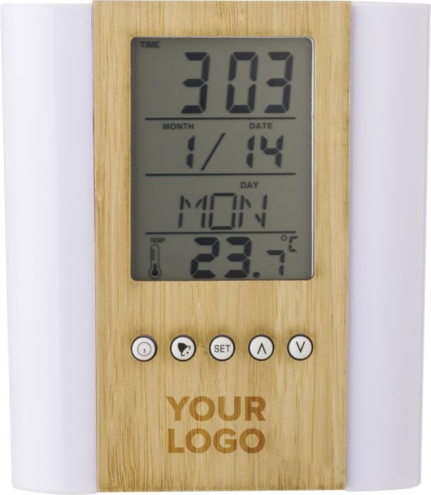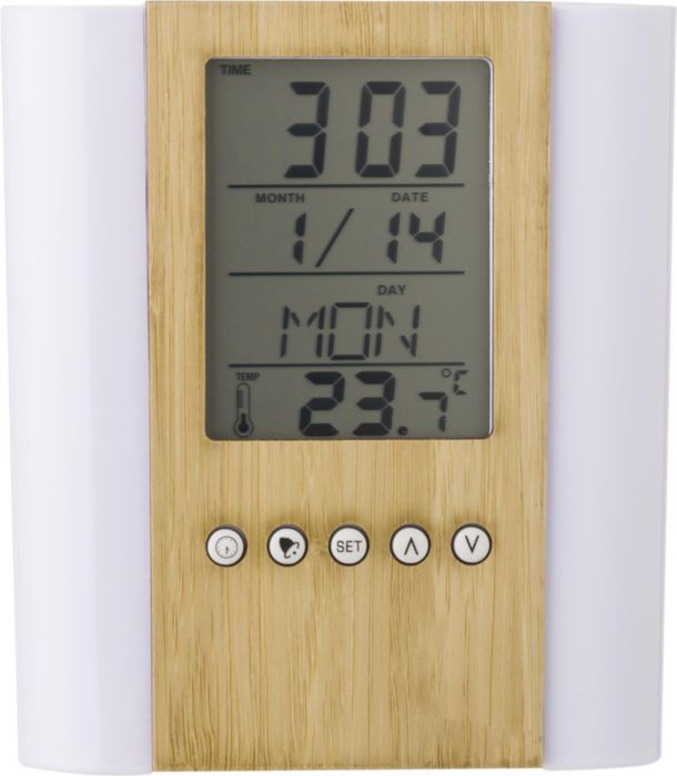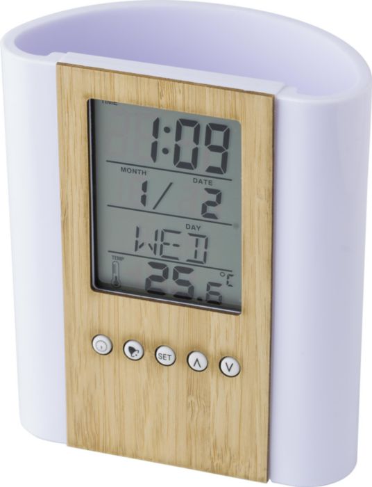 Pennhållare i bambu och plast med multifunktionell klocka. Funktioner: tid, inomhustermometer, kalender (dag, datum, månad), alarm och snooze, timer och födelsedagspåminnelser. Batterier ingår.