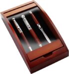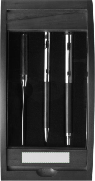 Penn set med kulspetspenna med vridmekanism, reservoarpenna och brevkniv i metall packat i en elegant träask. Svart Bläck.