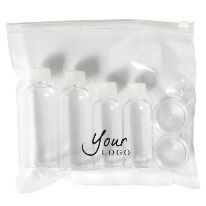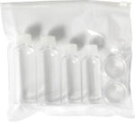 PETG resekit som innehåller två 100 ml flaskor, två 50 ml flaskor, två 10 ml burkar och en liten spatel.
