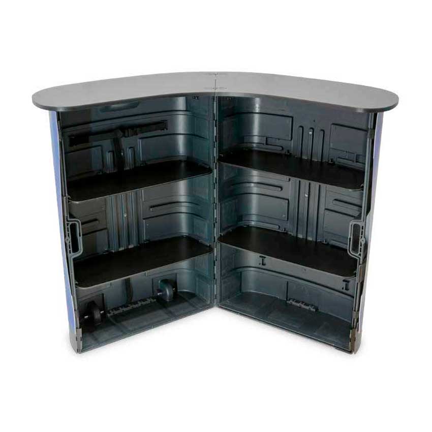 Den här monterdisken förvandlas till en stor v-formad disk på några minuter. Framsidan printas med er design eller logotype. Uppställd så erbjuder disken gott om förvaring tack vare de invändiga hyllplanen. Storlek hopfälld (mm) = D415xB640xH1000. Storlek utfälld (mm) = D590 x B1390 x H1010.