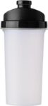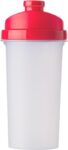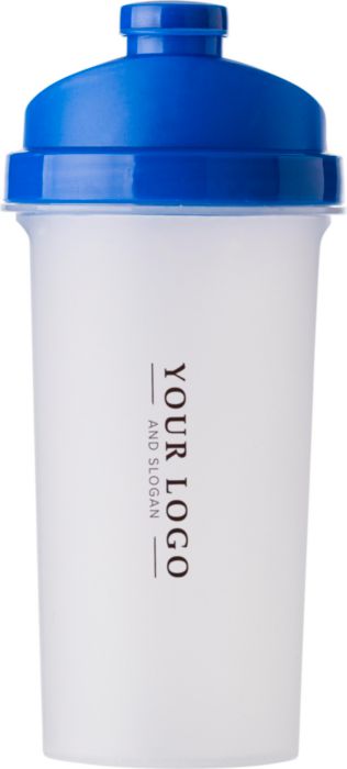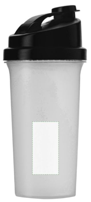 Proteinshaker i plast med sil och färgat lock. Märkt med milliliter-skala på ena sidan och Oz-skala på andra. Rymmer 700 ml.