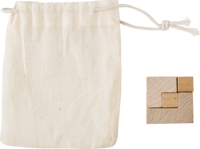 Pusselkub i trä. Förpackad i bomullspåse.