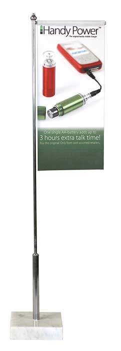 Bordsflagga stående med tryck på två sidor i egen design. För mast välj pylon mast samt även vilken fot ni önskar