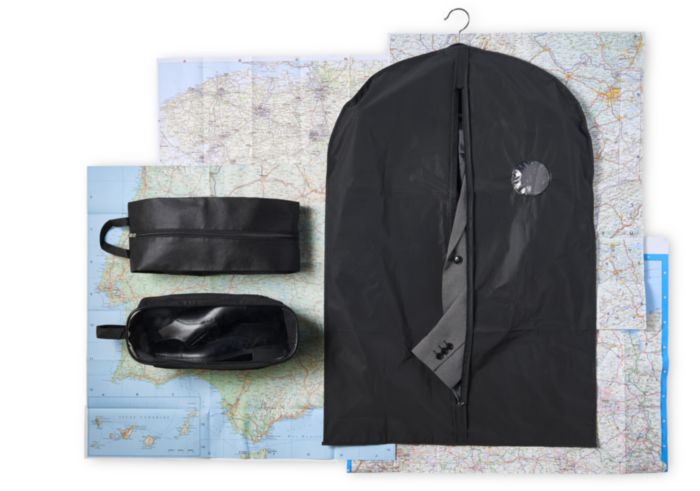 Resegarderob i PEVA med dragkedja (ca 72 cm) och ett transparent fönster på högra sidan (ca ø 8 cm).