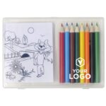 Set med 8 färgpennor och 20 målarblåd i transparent plastask.