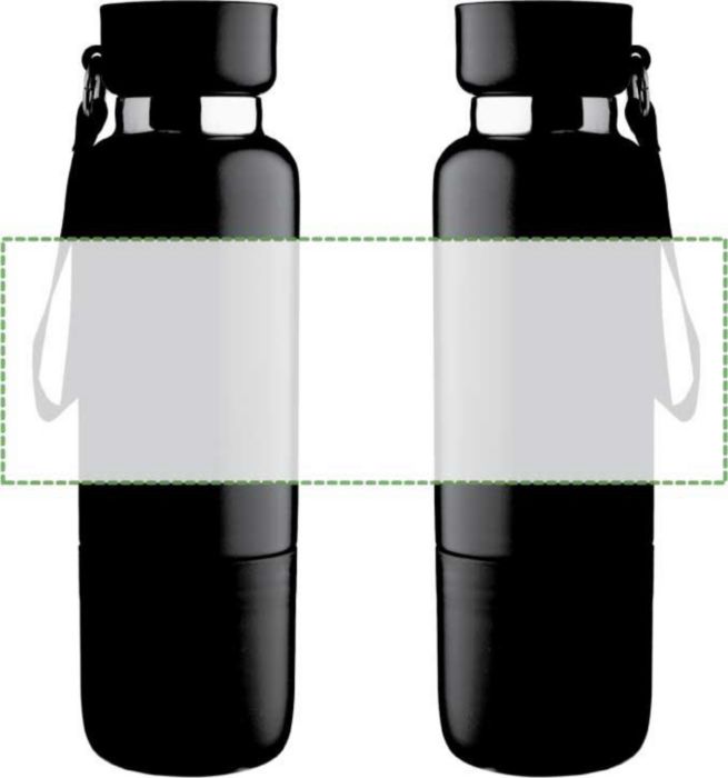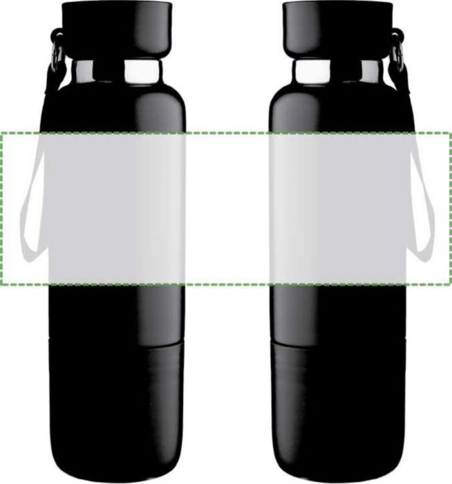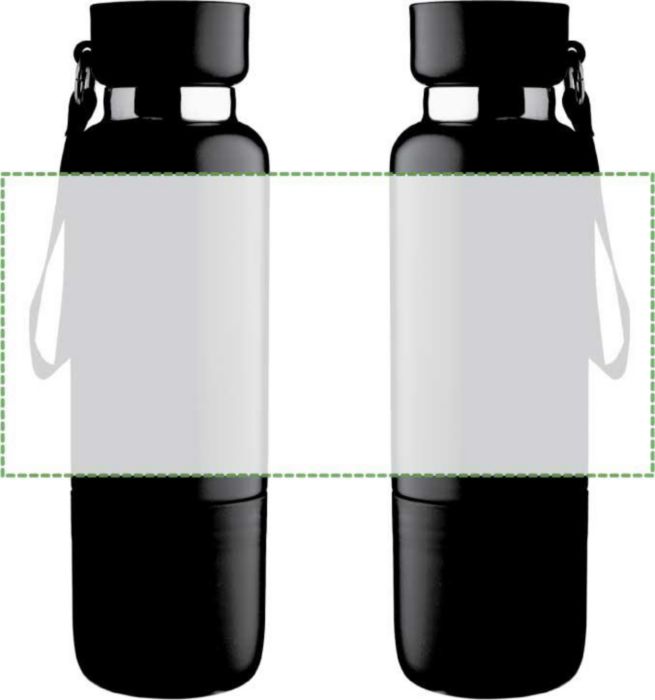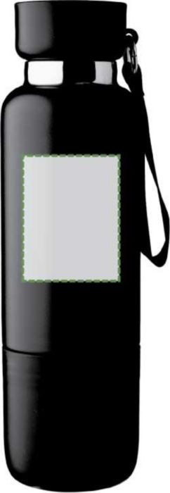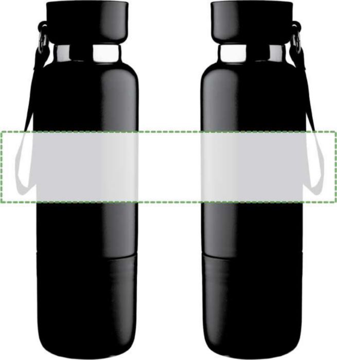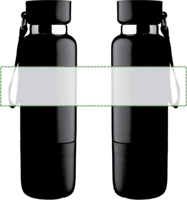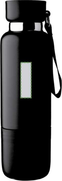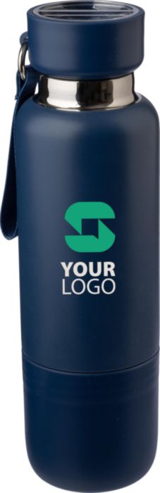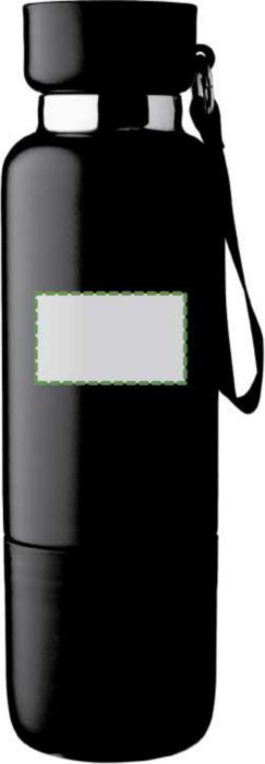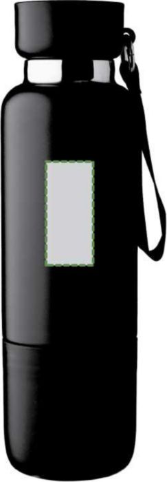 Vacuum dubbelväggig dricksflaska i rostfritt stål (500 ml) med en PP-mugg (300 ml) i botten. Insidan är av rostfritt stål 304, utsidan av rostfritt stål 201. PP-lock med AS transparent stängning, med en handledslina i polyester och bärrem. Matta färger. Individuellt förpackad i brun kartong.