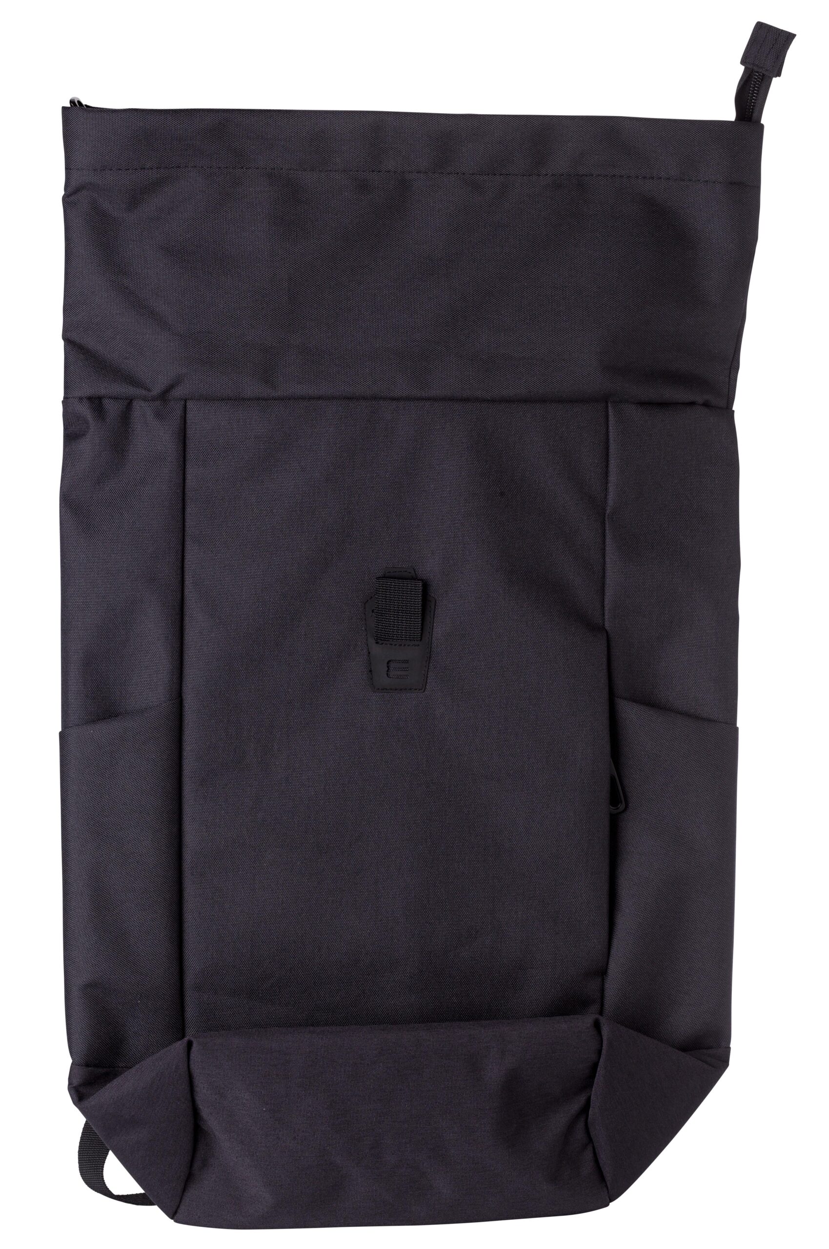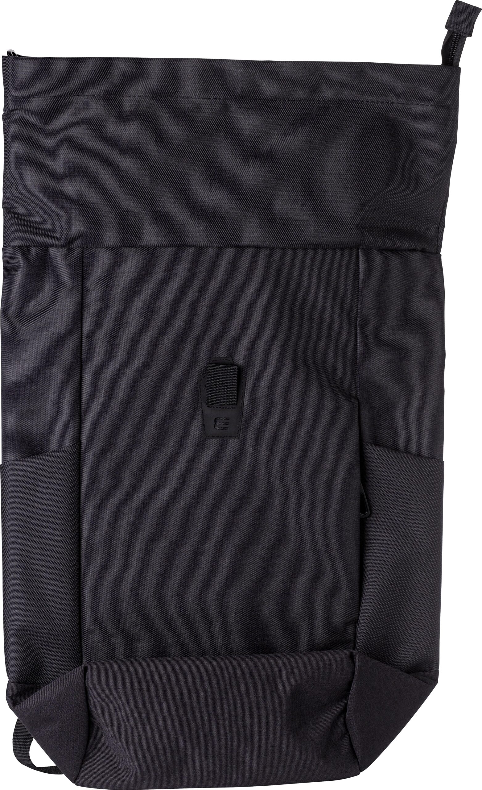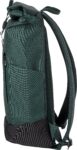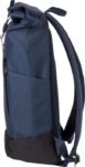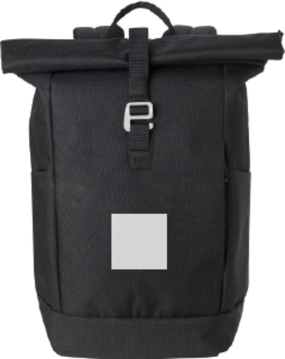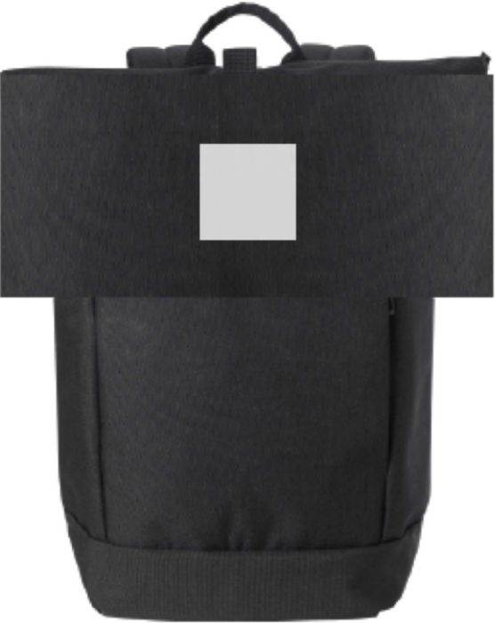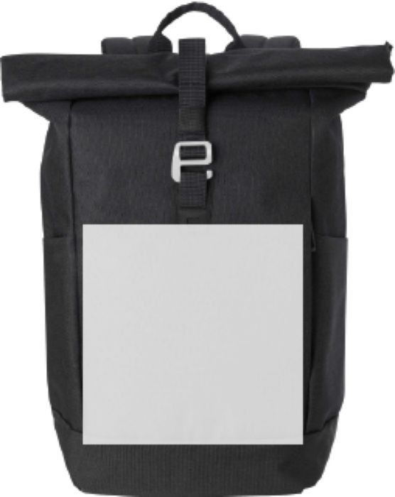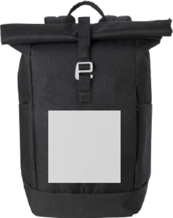 Polyesterryggsäck med rulltopp (600D). Ett stort fack med dragkedja och två öppna fickor samt ett laptopfack. Dragkedjefack fram. Vadderad baksida och axelremmar. Metallkrok för stängning.