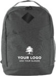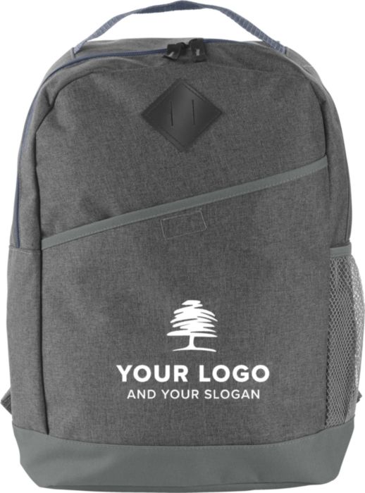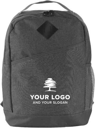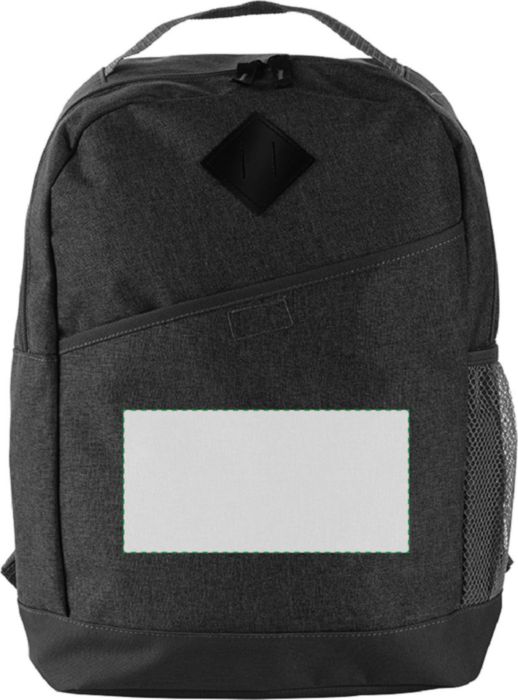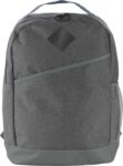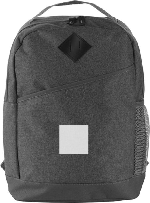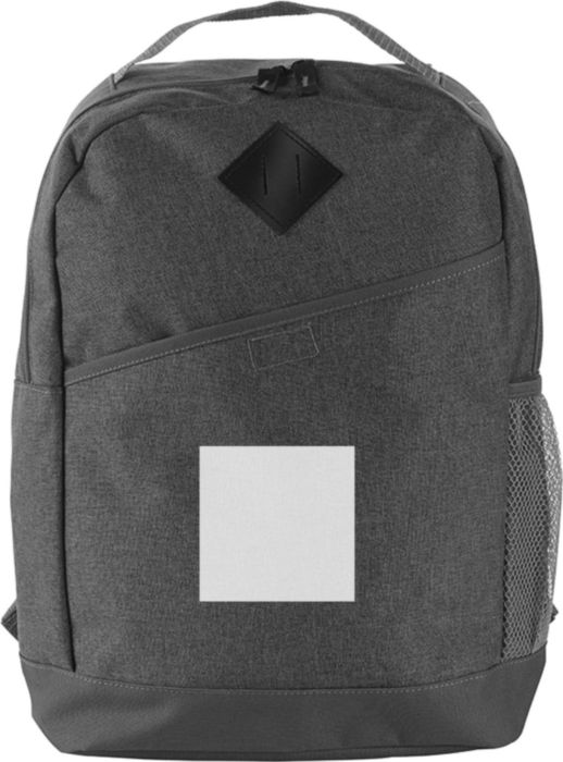 Snygg ryggsäck melerad grå 600D polycanvas. Snedskuren ficka på framsidan med kardborre. Utgång för headset. Matchande handtag och bärremmar.