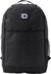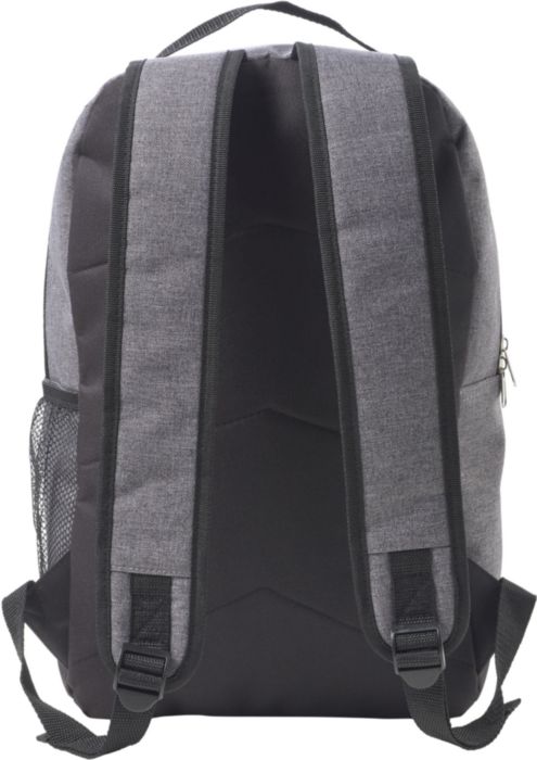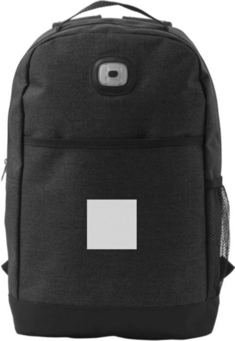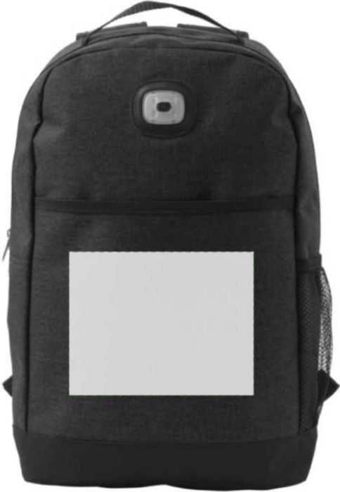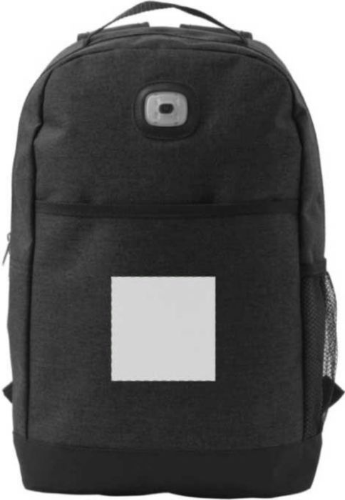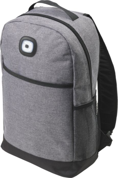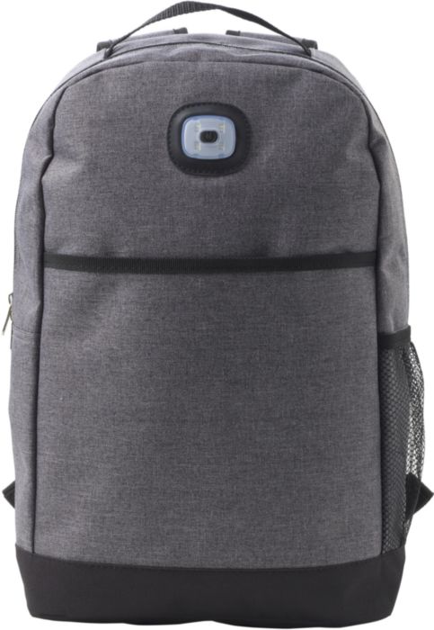 Melerad ryggsäck i polyester (300D + 210D) med reglerbara och vadderade remmar samt vadderad rygg. Stort huvudfack, framficka och sidoficka i nät. Ryggsäcken har en COB-lampa med två lägen; vitt och blinkande rött. Batterier ingår.