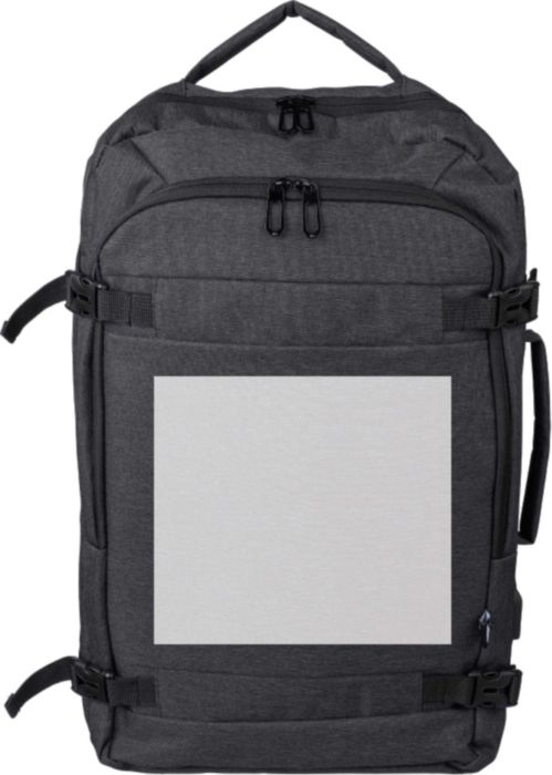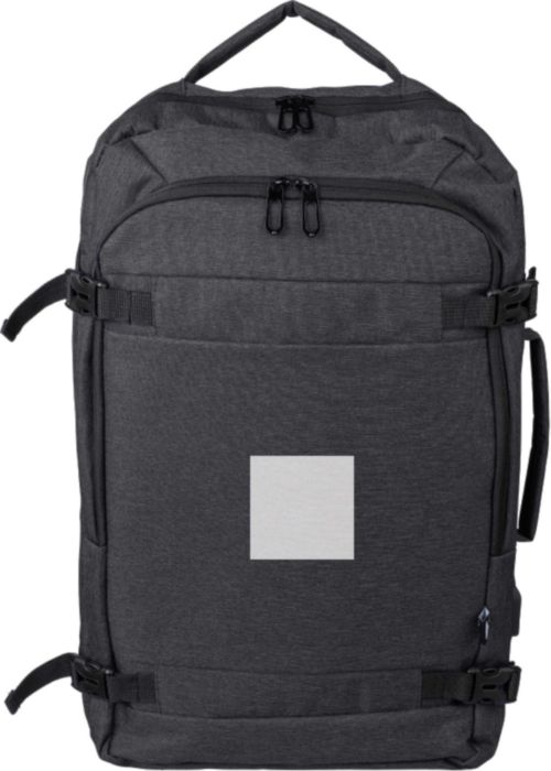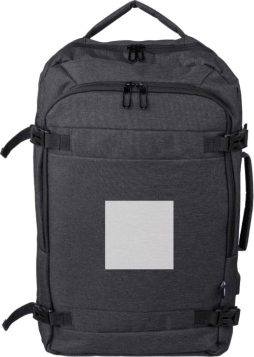 rPET polyester (300D) ryggsäck och laptopväska (17 tum) med 210D foder inuti. Hyttsäker. Med bärögla upptill och på sidorna. Kardborrfack för laptop, stöldskyddsficka och två stora fack med dragkedja. Ventilerad vadderad baksida, vagnrem, stängningsspännen och USB-A-port på sidan. Med sidospännen för att hålla bagaget kompakt. Bärvikt ca. 12 kg. Inkluderar rPET-etikett.
