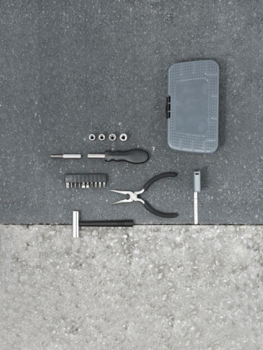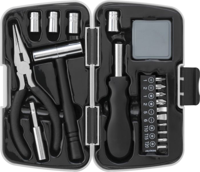 Set i 19 delar med verktyg av metall och aluminium. Snyggt förpackade i en avsmalnande plastkassett.