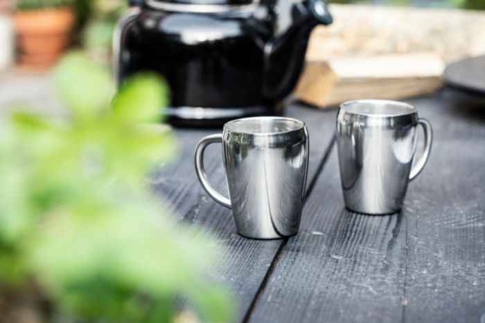 Ett set av 2 termomuggar, (200 ml), i rostfritt stål. Levereras i en presentförpackning. Logomärkning som visas är på en position (en produkt). Tål maskindisk.