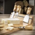 Skärbräda för ost i gummiträ med magnetupphängning och 4 bestick. Levereras i presentförpackning.
