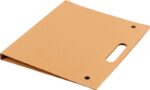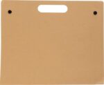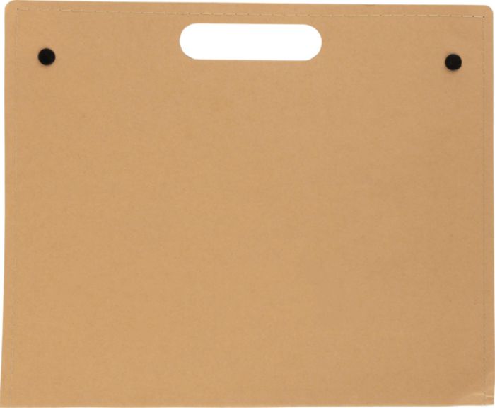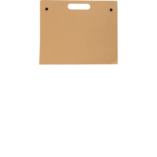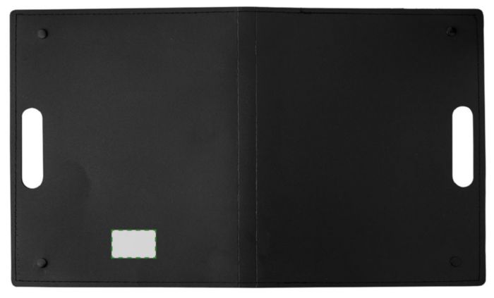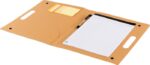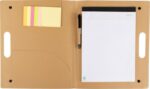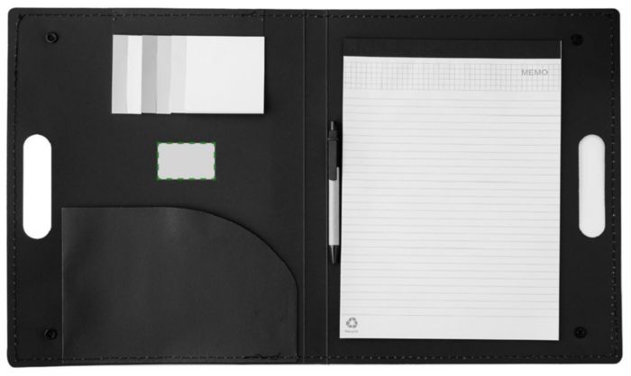 Skrivmapp i kartong med 20-sidigt anteckningsblock (ca A4), en penna i kartong (svart bläck) samt självhäftande notislappar i fyra färger med 25 ark per färg. Foldern har ett integrerat handtag.