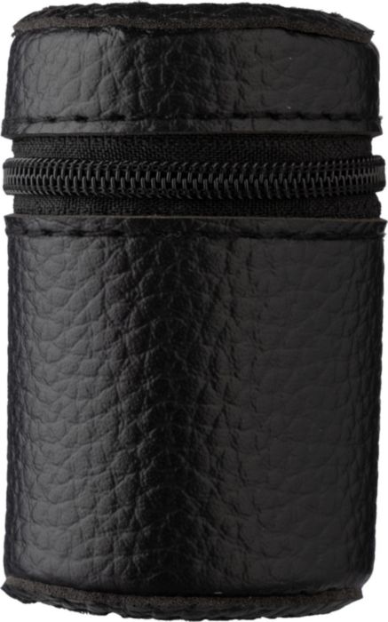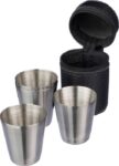 Små glas (30 ml) av rostfritt stål. Set med fyra stycken i ett fodral av PU-läder. Förpackat i en brun gåvoask.