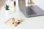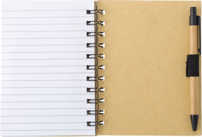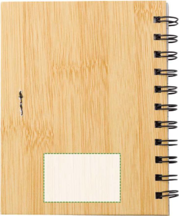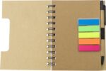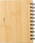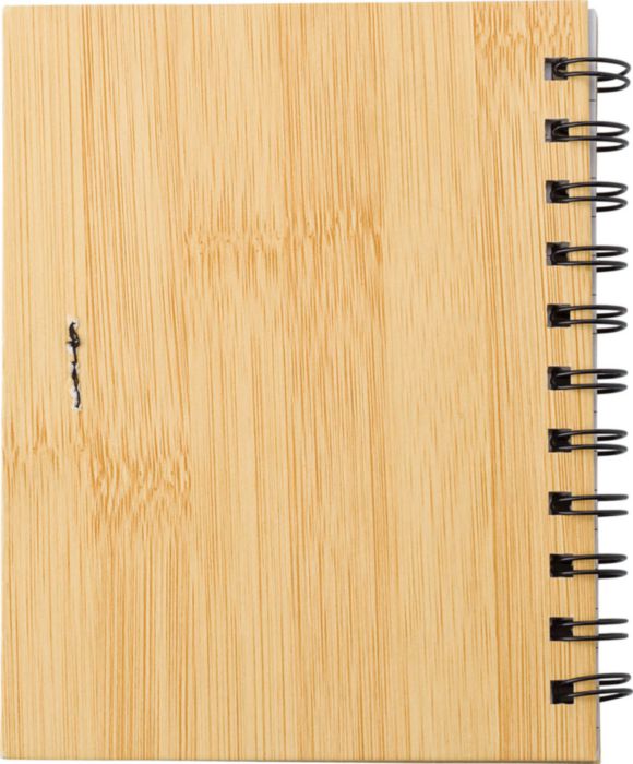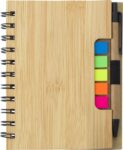Spiralbunden anteckningsbok med bambulook, 70 linjerade sidor. Notislappar i olika färger samt kulspetspenna med blått bläck.