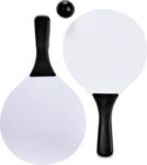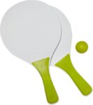 Strandtennis, ett set med två racket i trä med färgade plasthandtag och matchande boll. Leverereras i ett vit nät. Logomärkning som visas är på en position (en produkt).