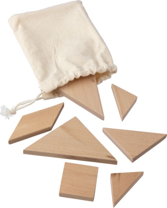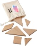 Tangrampussel i trä. Förpackad i en bomullspåse med dragsko.