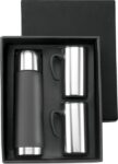 Termosset i rostfritt stål med termosflaska (500 ml), och 2 muggar, 30 cl, i presentförpackning. Totalt 3 delar.