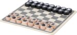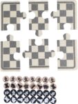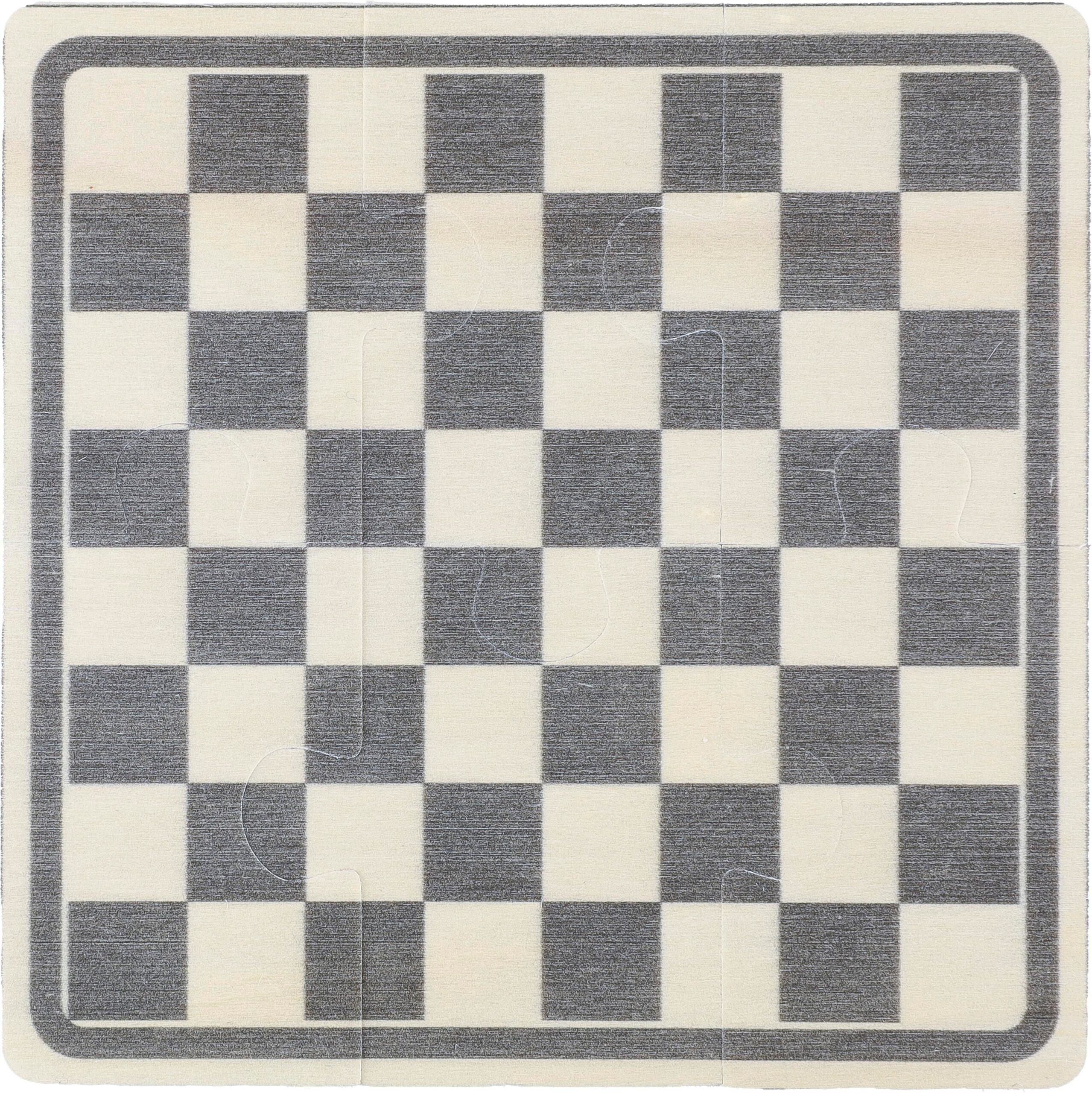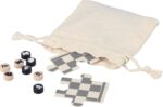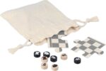 Schack- och damspel i trä i en bomullspåse med dragsko. Innehåller ett 6-bitars tryckt pussel (svart/naturlig spelplan) för att montera spelbrädena, och 16 tryckta spelpjäser med schackspelardesign i natur och svart. Inkluderar spelinstruktioner. Etikett inuti påsen. Spelplanen är gjord av polywood och spelpjäserna är gjorda av furu.