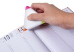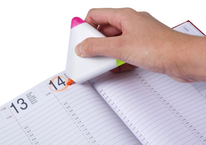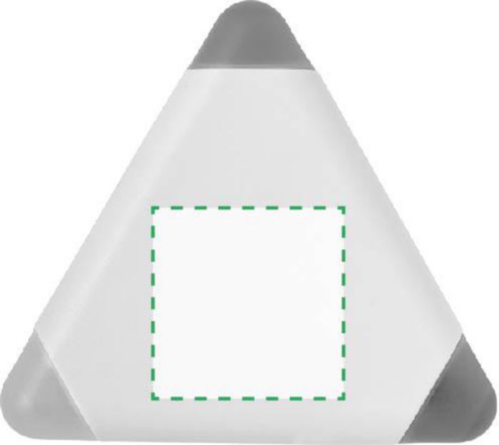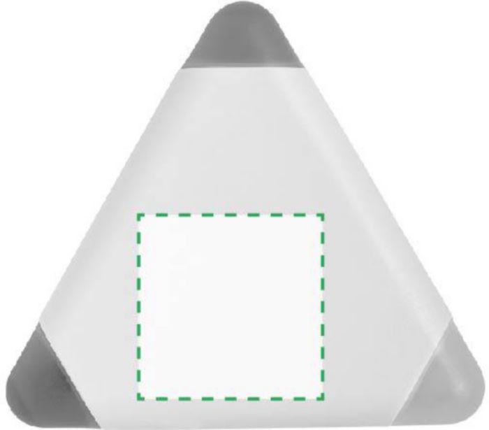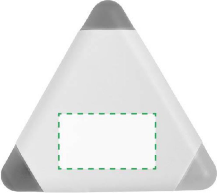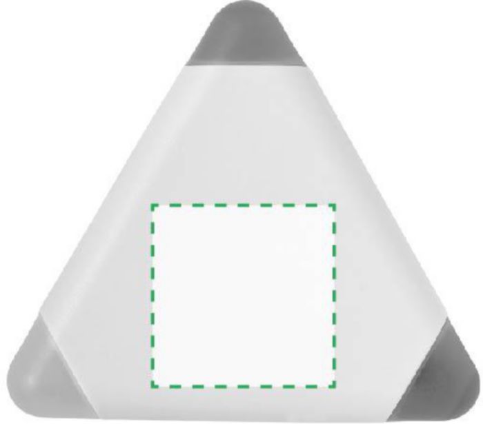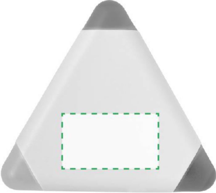 Trekantig överstrykningspenna i ABS. Varje hörn har en penna i färgen rosa, orange eller gul.