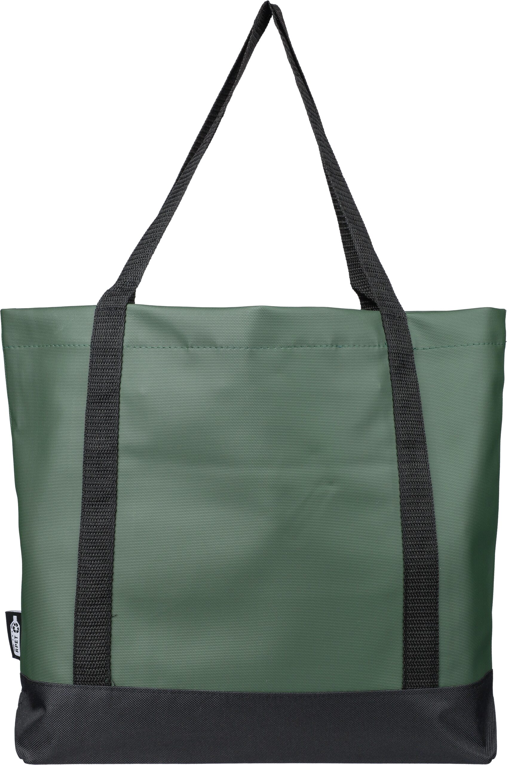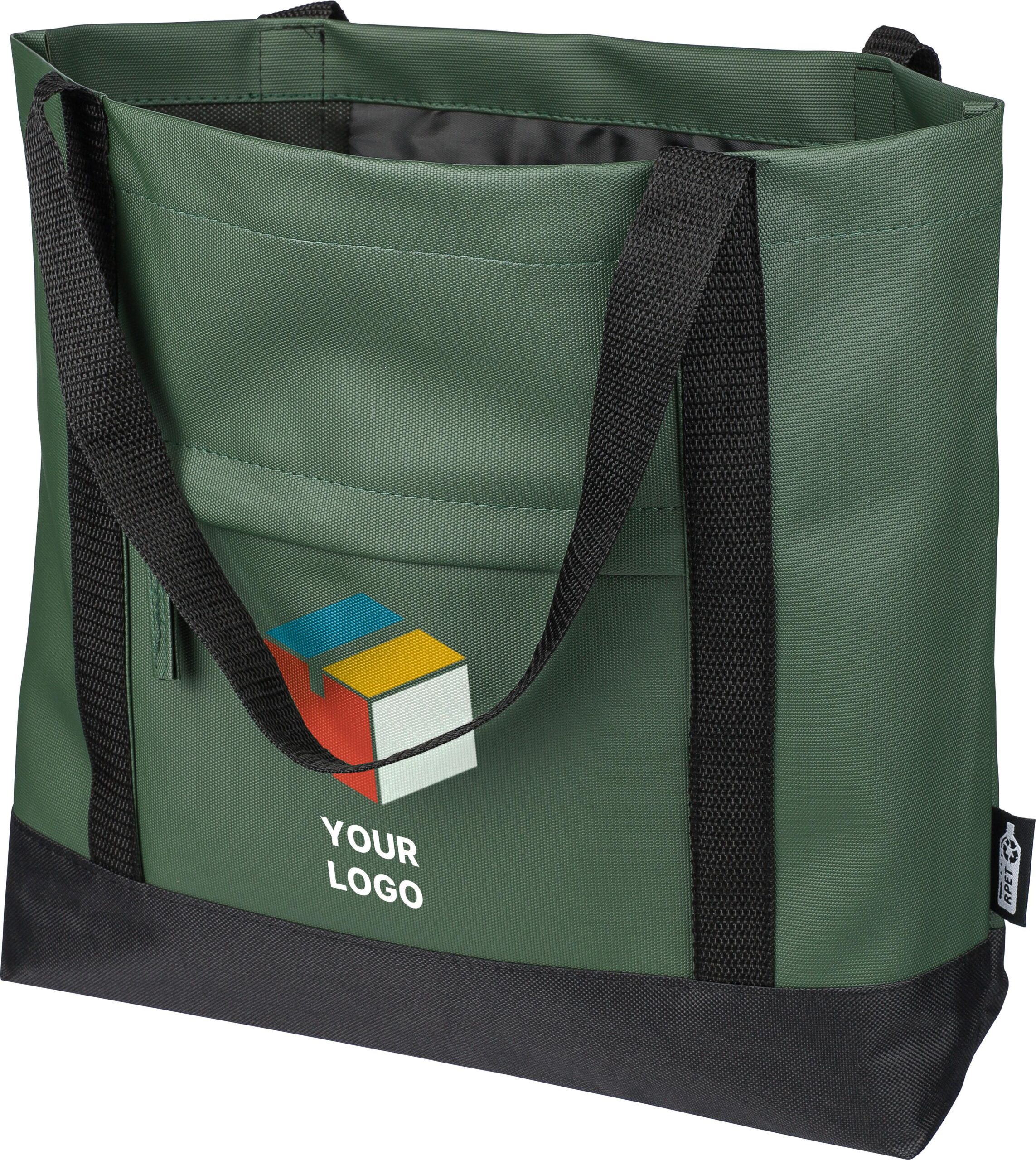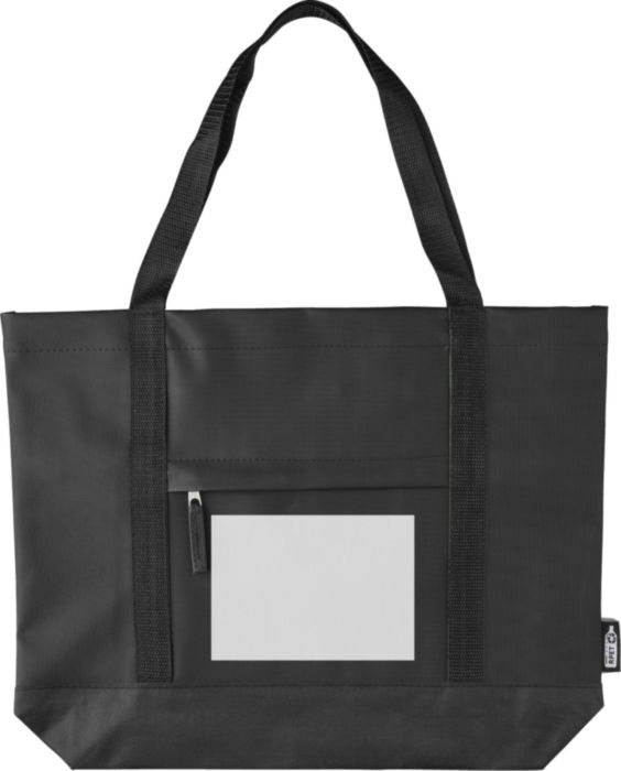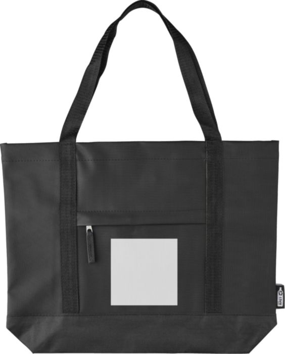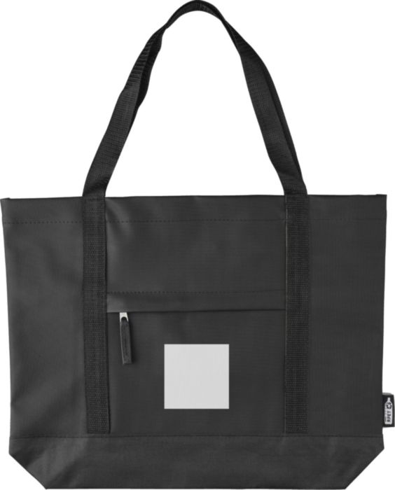 rPET (600D) polyesterväska med PU-beläggning på båda sidor för vattenavvisande egenskaper. Har ett framfack med dragkedja, en liten ficka med dragkedja inuti och långa bärhandtag. Utformad med en kapacitet på 10 liter och en bärkapacitet på 10 kg. Inkluderar en rPET-etikett.