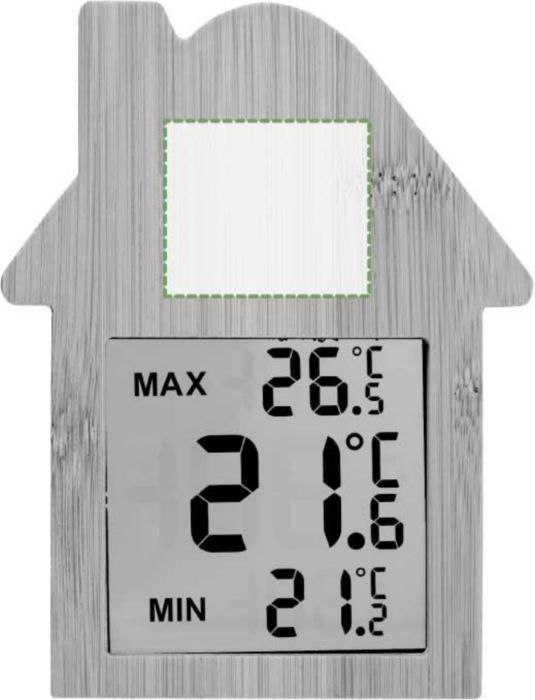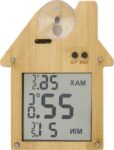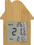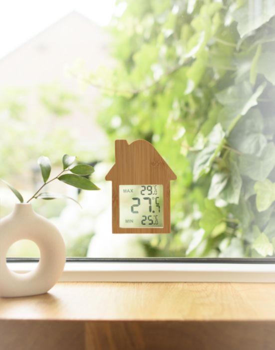 Väderstation av bambu, formad som ett hus. Med sugkopp på baksidan. Funktioner: aktuell temperatur, lägsta temperatur och maxtemperatur. Batterier ingår. Individuellt förpackad i brun kartong.