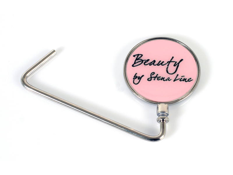 Praktisk hängare för handväskan eller kassen. Att placera på bordsskivan. Anti-glid-material på baksidan. Upp till fyra färgers design på metallmärket. Med eller utan epoxyöverdrag.