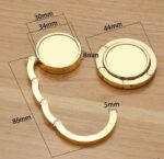 Praktisk hängare för handväska eller kassen att placera på bordsskivan. Enkel att vika ihop och ta med. Anti-glid-material på undersidan. Upp till fyra färgers design på metallmärket. Silver eller guld. Med eller utan epoxyöverdrag.