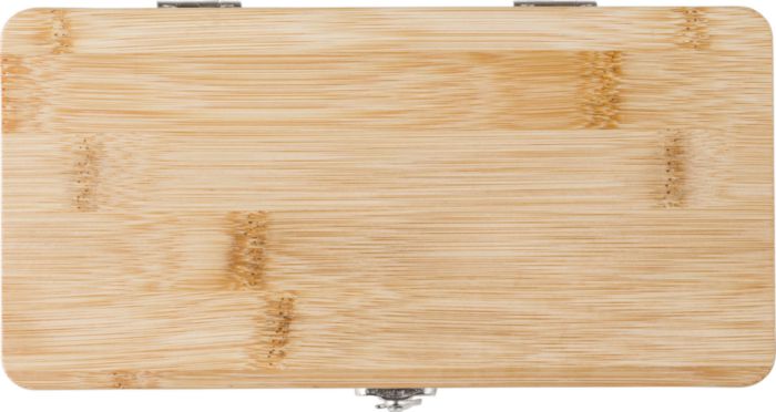 Verktygssats i kolstål med 27 delar: tre skruvmejslar, tio bits i hållare, tre slitsstorlekar, tre Torx-storlekar, en adapter, fyra hylsor, en skärare, ett handtag och en kontakt. Förpackad i bambufodral med järnklämma.