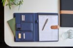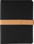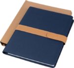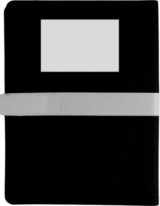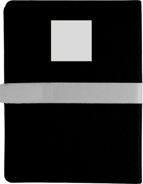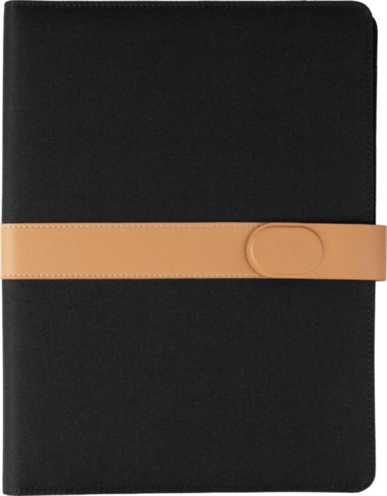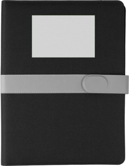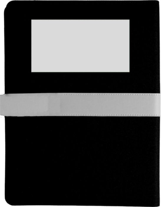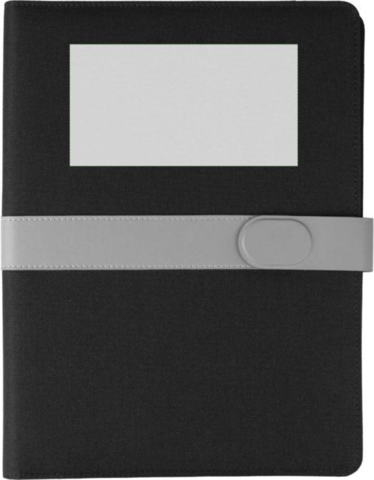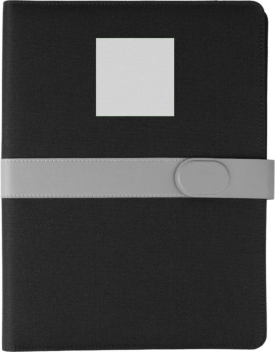 Vikbar mapp av rPET (ca A4) med PU-detalj på omslaget. Inkluderar anteckningsbok med 20 raderade sidor (70g), flera fack, pennögla och magnetisk stängning. Individuellt packad i förpackning av kraftpapper.