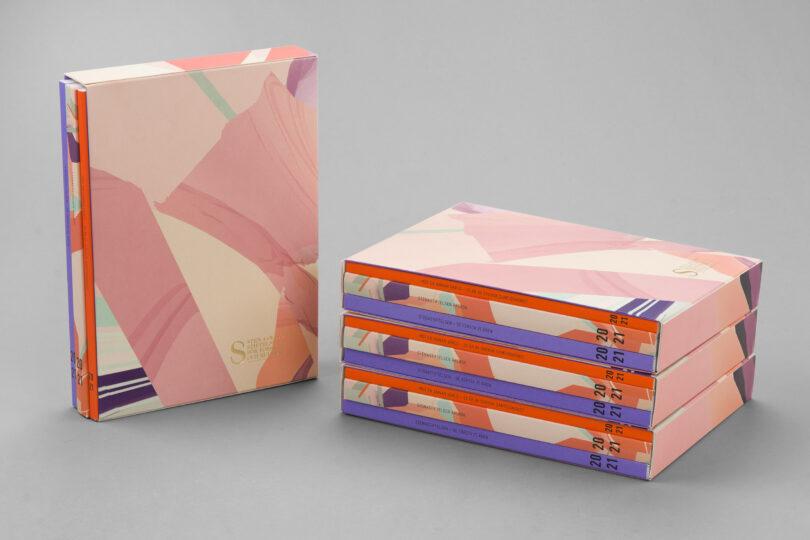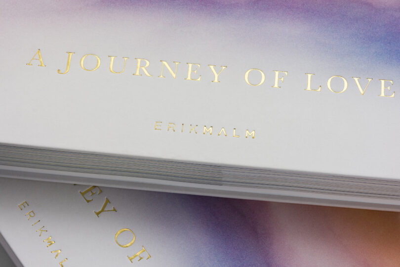 Tryckt pärmöverdrag med foliering på framsida och rygg (Kurz 428).