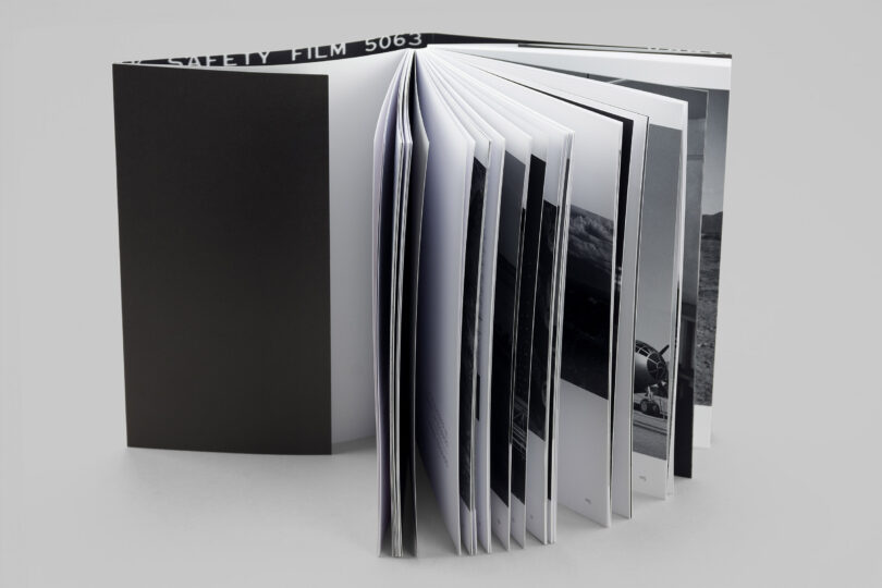 Trådbunden broschyr med öppen rygg, sydd med vit tråd.