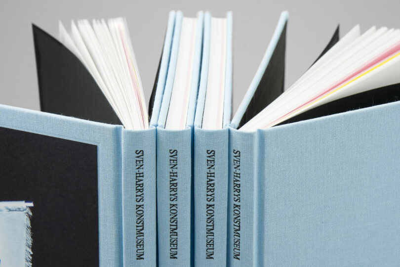 Hårdbunden bok med flat folierad typografi på framsida och rygg. Präglad platta med handmonterad bild på omslagets baksida.