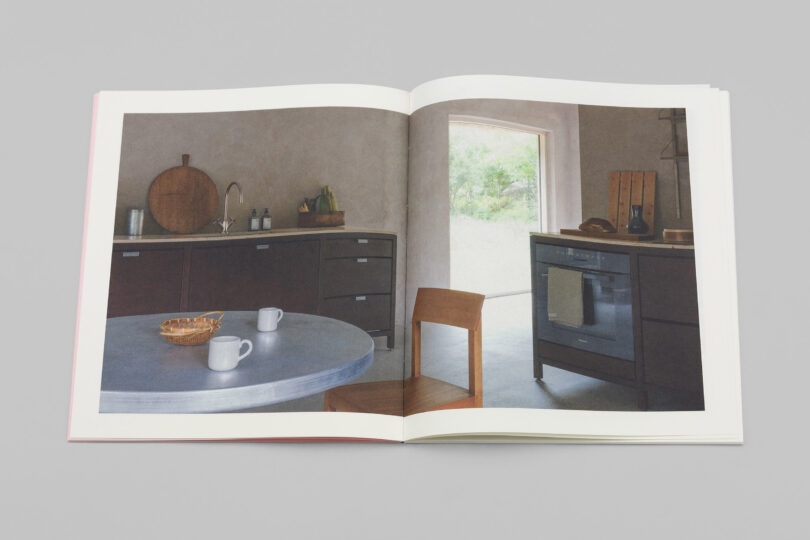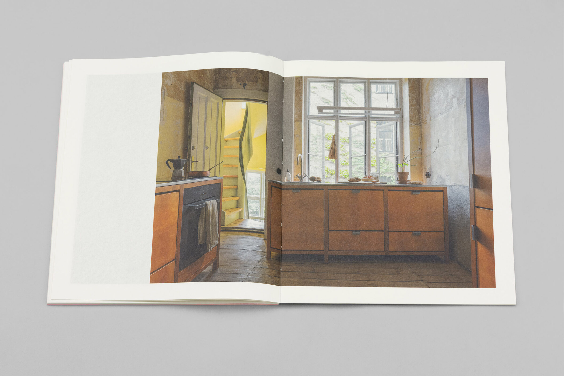 Linnetrådshäftad broschyr med öppen rygg, sydd med vit tråd.