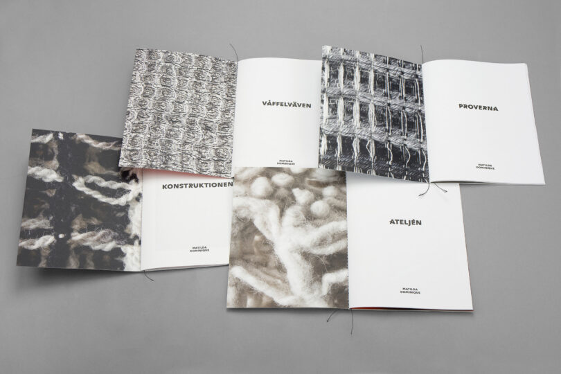 Fyra broschyrer med sydd rygg. Stansat slipcase.