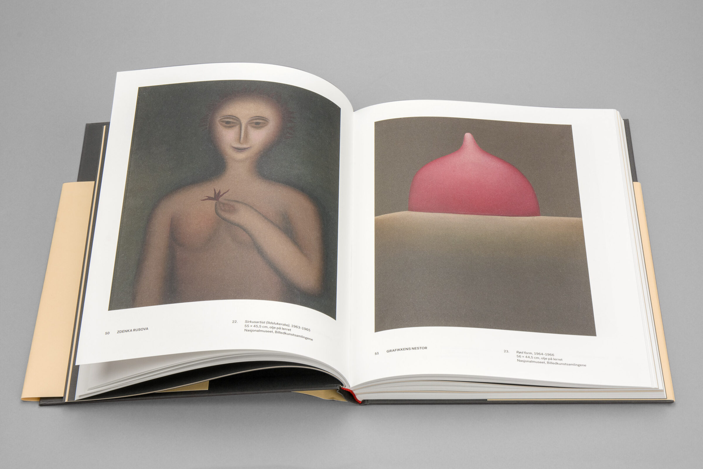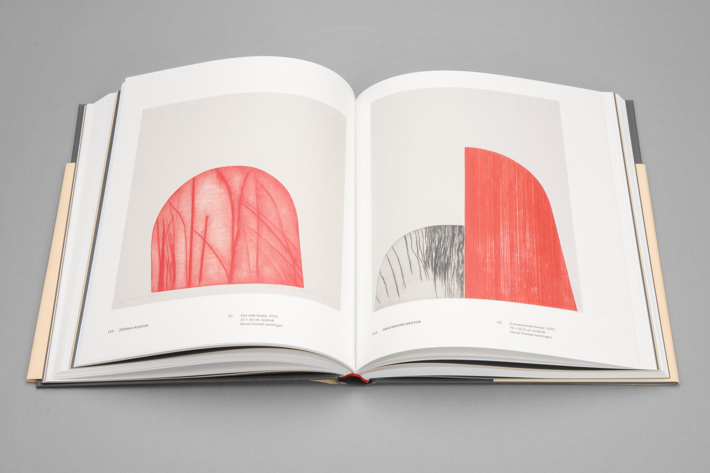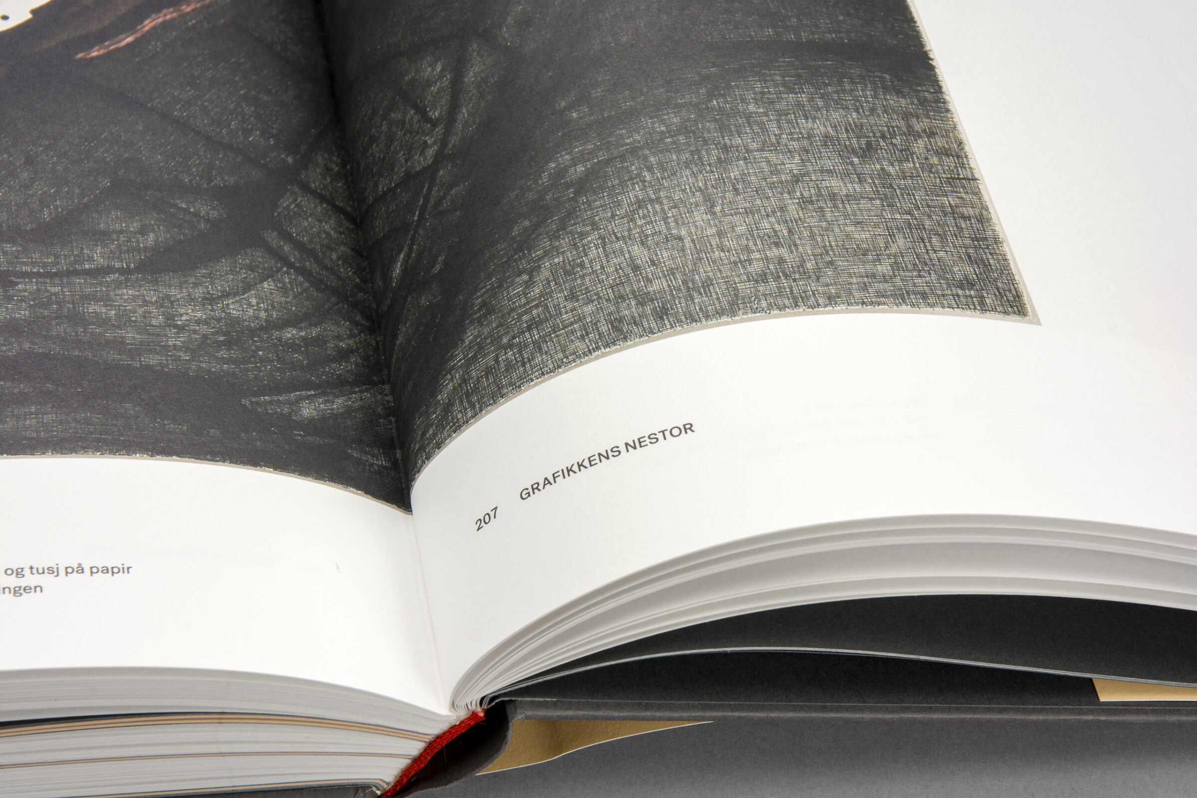 Svart folie och debossed prägling på omslagets framsida. Rött kapitälband.